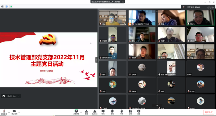 為進(jìn)一步深入學(xué)習(xí)貫徹黨的二十大精神,大力弘揚(yáng)偉大抗疫精神,11月29日上午,集團(tuán)技術(shù)管理部黨支部組織線(xiàn)上開(kāi)展“聚焦二十大 奮進(jìn)新征程”主題黨日活動(dòng)。活動(dòng)由黨支部書(shū)記周燦偉主持,集團(tuán)黨委委員、總工程師王猛及支部全體黨員、入黨積極分子參加。