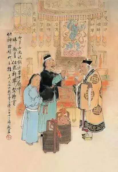 “拜織女”純是少女、少婦們的事。她們大都是預先和自己朋友或鄰里們約好五六人,多至十來人,聯(lián)合舉辦。舉行的儀式,是于月光下擺一張桌子,桌子上置茶、酒、水果、五子(桂圓、紅棗、榛子、花生,瓜子)等祭品;又有鮮花幾朵,束紅紙,插瓶子里,花前置一個小香爐。那么,約好參加拜織女的少婦、少女們,齋戒一天,沐浴停當,準時都到主辦的家里來,于案前焚香禮拜后,大家一起圍坐在桌前,一面吃花生,瓜子,一面朝著織女星座,默念自己的心事。如少女們希望長得漂亮或嫁個如意郎、少婦們希望早生貴子等,都可以向織女星默禱。玩到半夜始散。